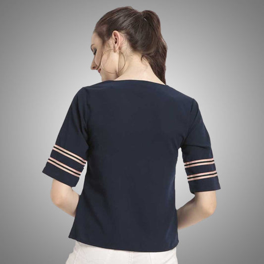 Casual Bishop Sleeve Embroidered Women Grey Top Navy Blue