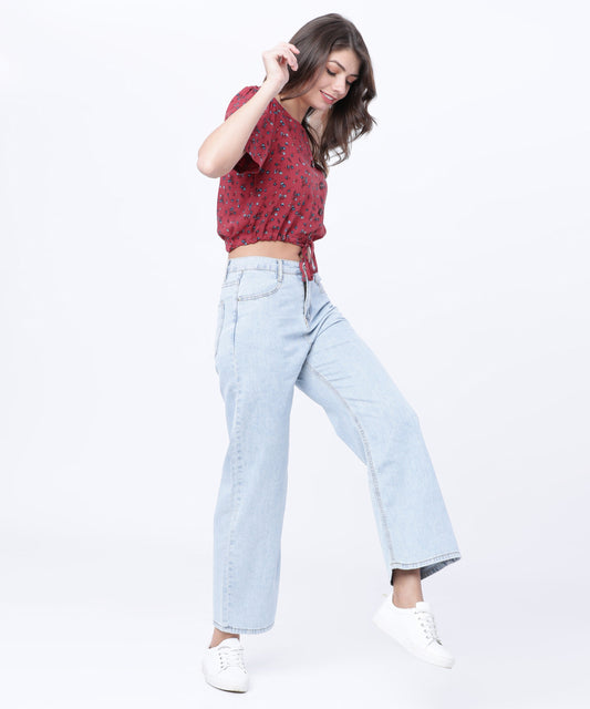 Casual Bishop Sleeve Embroidered Women Grey Top Maroon